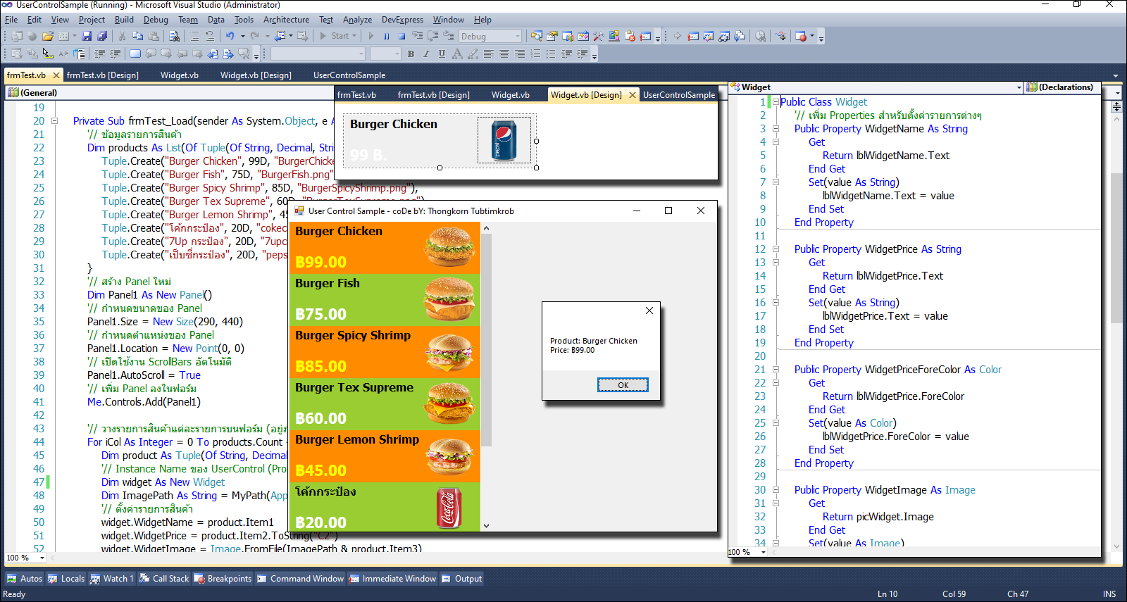 การสร้าง User Control ก็คือการนำ Control ต่างๆที่อยู่ในกลุ่มของเครื่องมือ (ToolBox) เพื่อนำมาสร้างเป็น Control ตัวใหม่ขึ้นมาใช้งานโดยเฉพาะ ตัวอย่างนี้เป็นการสร้างปุ่มคำสั่ง เพื่อให้แสดงผลรายชื่อสินค้า ราคา และภาพประกอบ ... โค้ดตัวอย่างประกอบนี้จะใช้งานในแบบไดนามิค คือต้องสั่งรันโปรแกรมให้ทำงานถึงจะเห็นผล (Run Time) เพื่อให้เกิดความยืดหยุ่น และมีประสิทธิภาพ ...